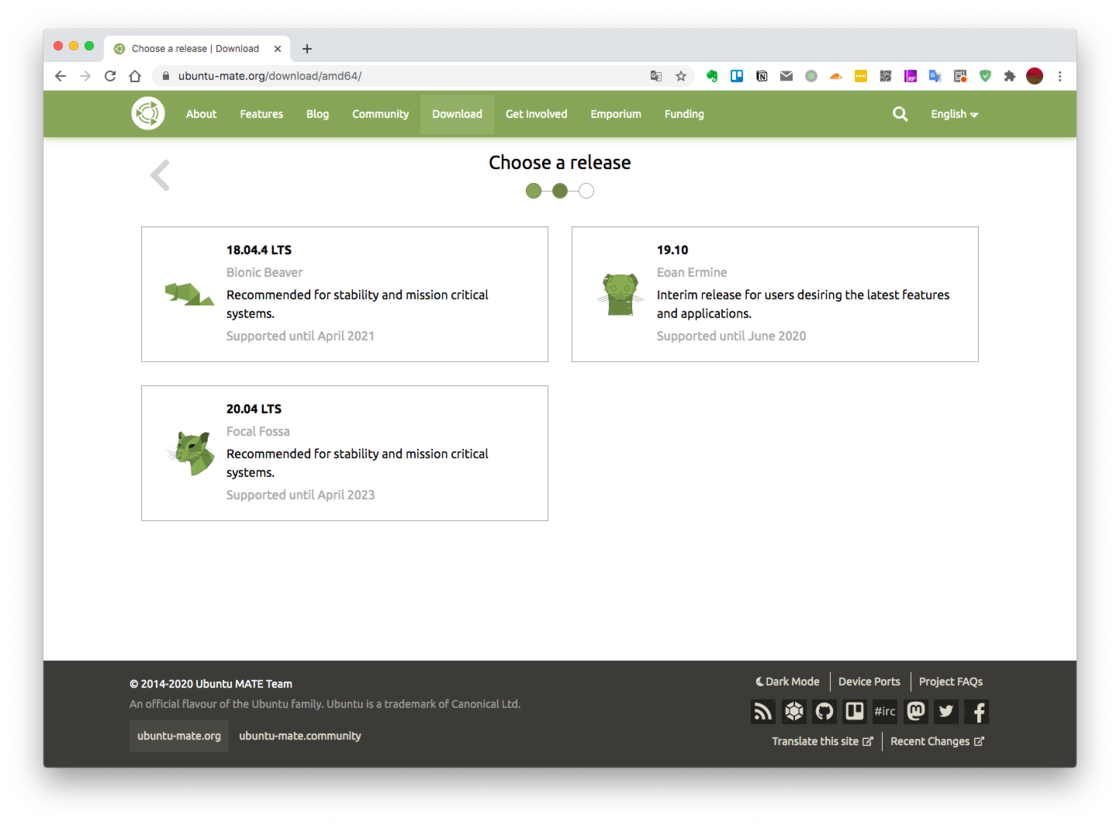 首先我们需要制作一个基于 debian 的 Linux 发行版 的 live USB,可以在不执行安装的前提下通过 U 盘运行系统,这里我挑选了我个人比较熟悉的 Ubuntu Mate 最新镜像,这里我在其官网上下载了64 位的「ubuntu mate 20.04 LTS」镜像。