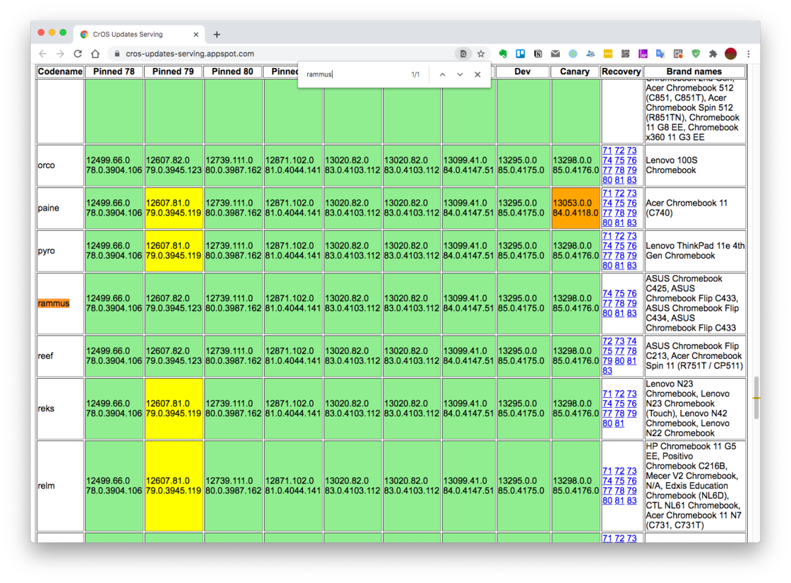 下面我们准备 Google 官方的 Chrome OS 恢复镜像,打开这个 离线镜像搜集网站,然后使用快捷键 CTRL + F 搜索关键字「rammus」,然后在对应的表格行的「Recovery」中点击「83」下载恢复镜像。