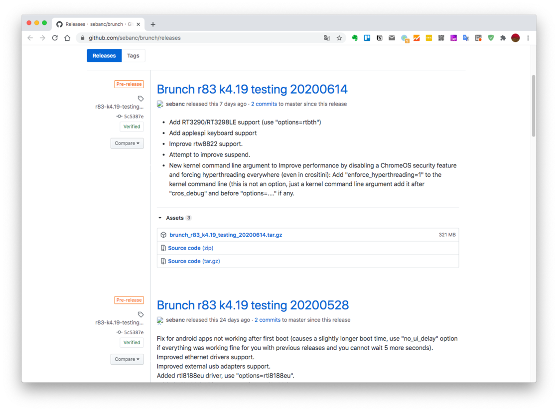 紧接着我们需要下载 Chrome 安装框架,开发人员 sebanc 开发的 Brunch 构建框架,这里我们直接在其 GitHub 中下载,因为我们安装的是最新版的 Chrome OS,因此选择最新预发行版本「Brunch r83 k4.19 testing 20200614」进行下载。