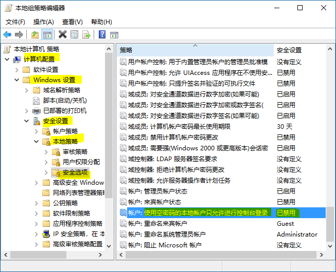 然后,在打开的组策略窗口中,依次选择 计算机配置→Windows 设置→安全设置→本地策略→安全选项,然后在右边窗口中找到 账户:使用空密码的本地账户只允许进行控制台登陆 选项,双击打开。
