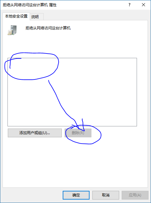 将 拒绝从网络访问这台计算机 里面的所有用户选中,点击删除,然后点击确定,即可。