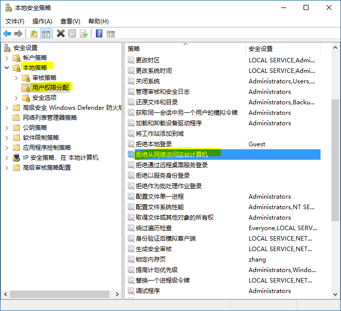 然后,在打开的本地安全策略左边窗口,依次选择 安全设置→本地策略→用户权限分配,然后在右边窗口找到 拒绝从网络访问这台电脑,双击打开。
