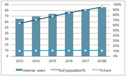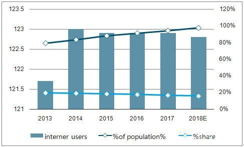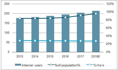 截止2018年6月,中国网民规模达到8.02亿人,2018上半年新增网民数量为2968万人,与2017年相比增长3.8%,互联网普及率为57.7%。